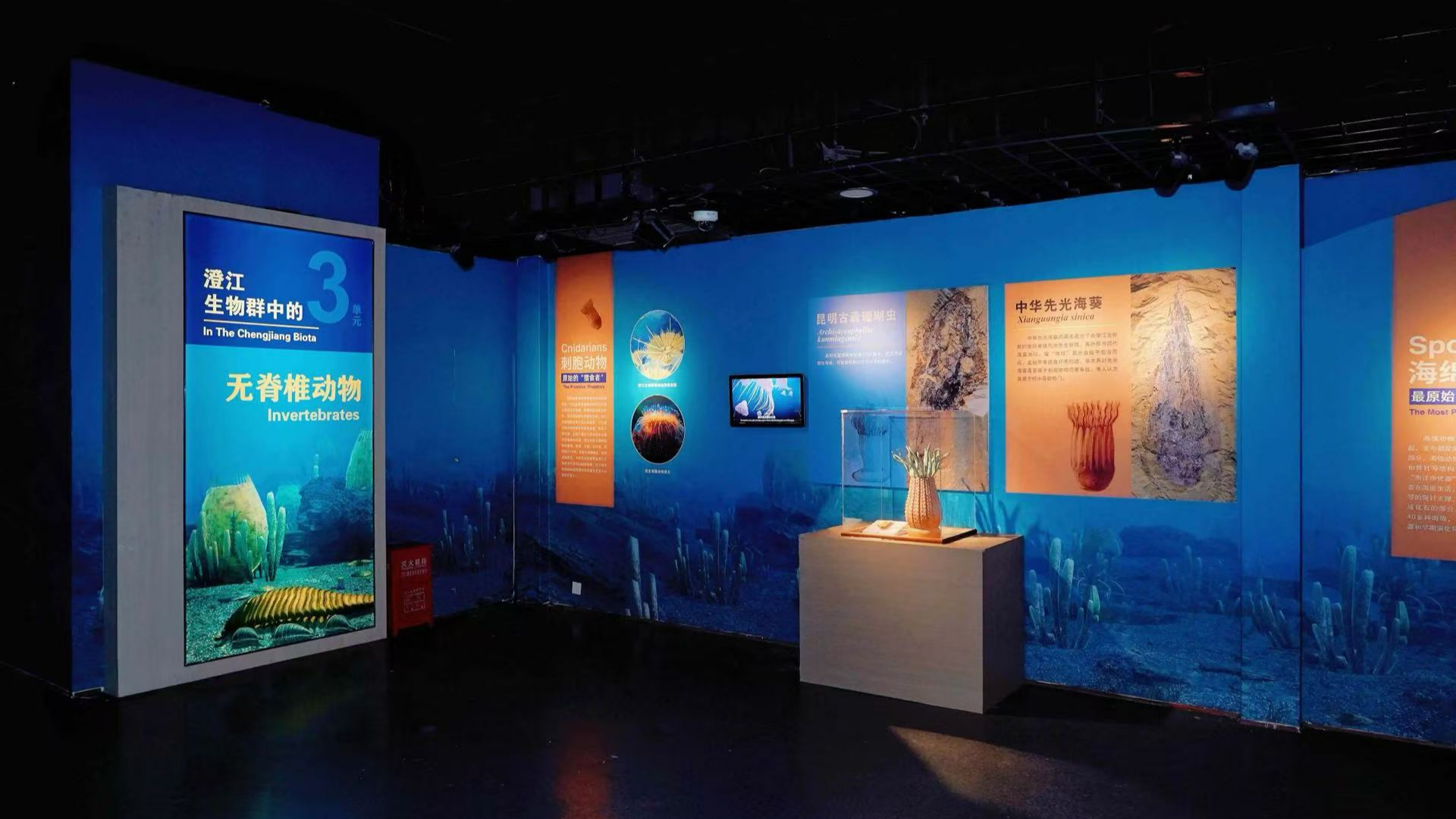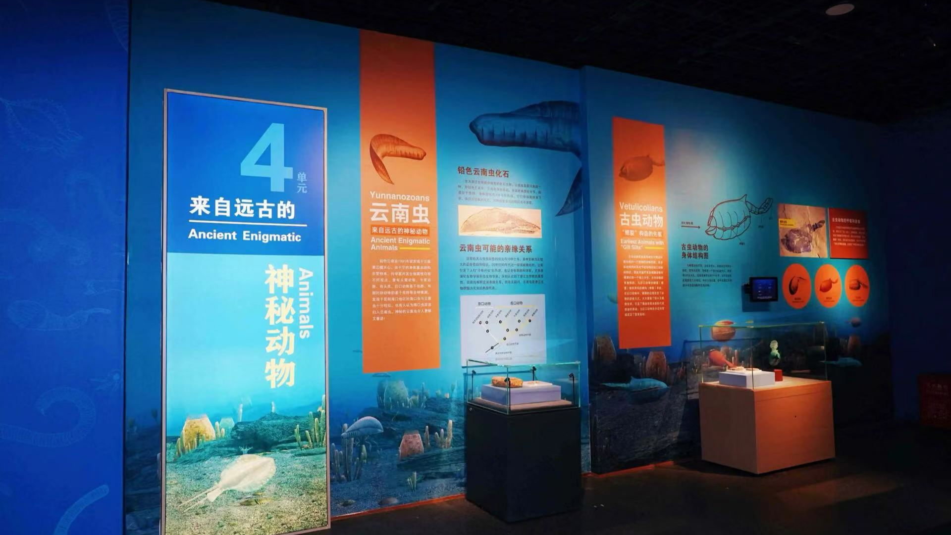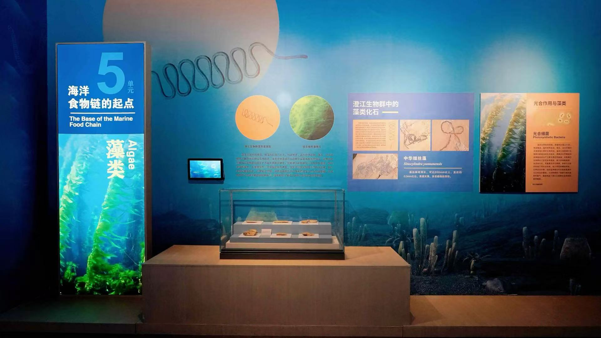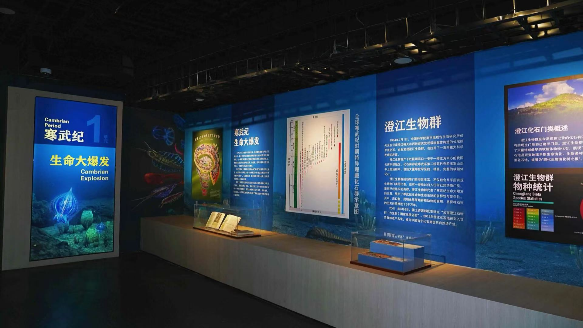展览分为“寒武纪生命大爆发”“澄江生物群中的脊椎动物”“澄江生物群中的无脊椎动物”“来自远古的神秘动物”“海洋食物链的起点——藻类”五个单元,运用多媒体展示、精细模型复原等手段,展出包括“天下第一鱼”昆明鱼类、最原始的后生动物海绵动物、寒武纪海洋霸主奇虾、“鳃裂”构造的先驱古虫动物、海洋食物链的起点藻类等澄江生物群代表性化石及模型,为观众生动再现大约5.18亿年前多姿多彩的海洋世界。
